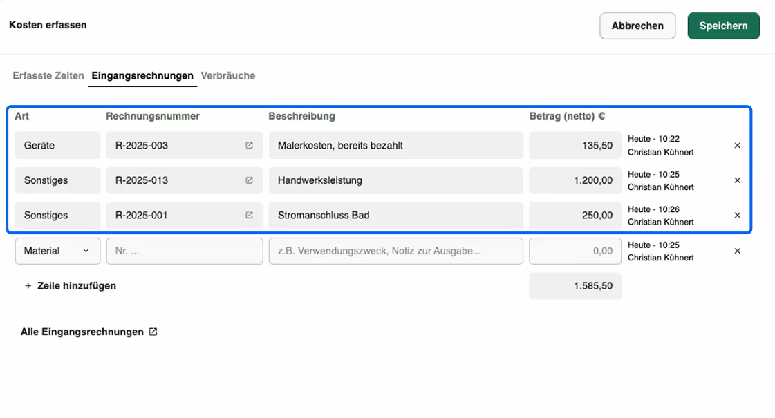 Mit den neu eingeführten Eingangsrechnungen kannst du Belege, Rechnungen und Gutschriften als PDF, Bild oder in E‑Rechnungsformaten (XML) hochladen. Unsere KI liest die Rechnungsdaten automatisch aus; du prüfst sie, weist sie Projekten zu und buchst die Kosten.