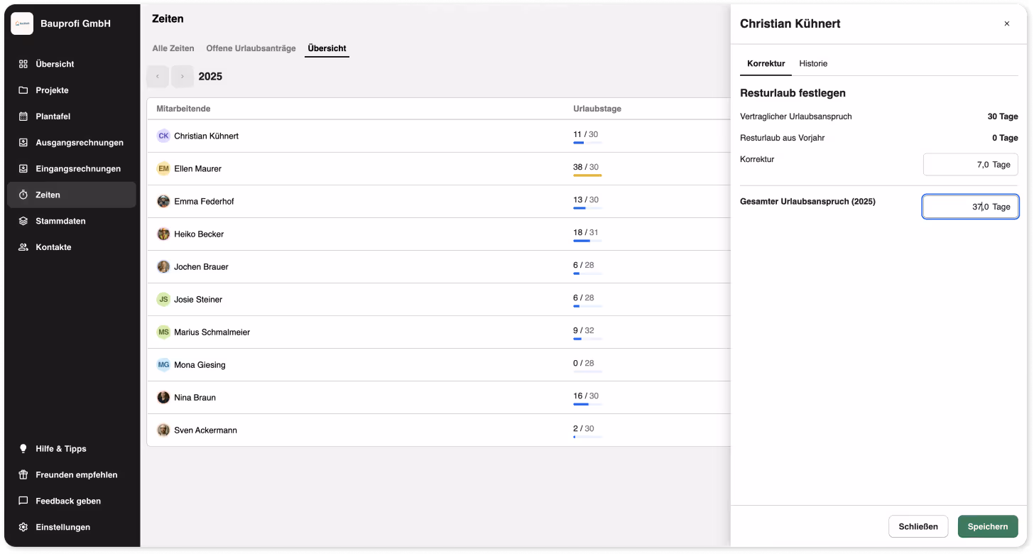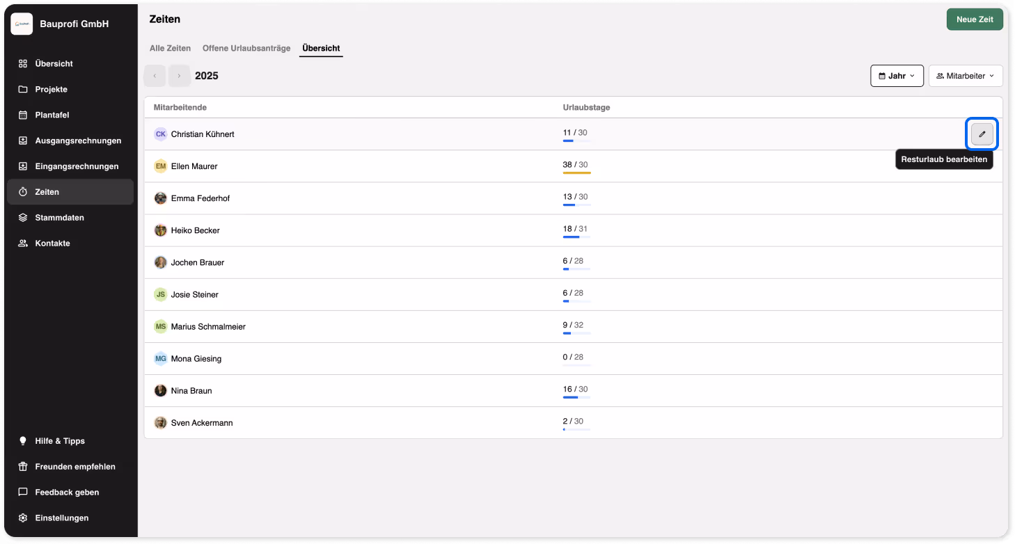 Über den Bearbeiten-Button lässt sich der Gesamturlaubsanspruch in der Übersicht ganz einfach anpassen. Du kannst entweder den gesamten Anspruch ändern oder nur einzelne Tage hinzufügen oder abziehen. Nach dem Speichern wird der aktualisierte Wert direkt in der Liste angezeigt. Falls Mitarbeiter erst im Laufe des Jahres in eueren Betrieb gestartet haben, kannst du den Urlaubsanspruch über den selben Weg anpassen.