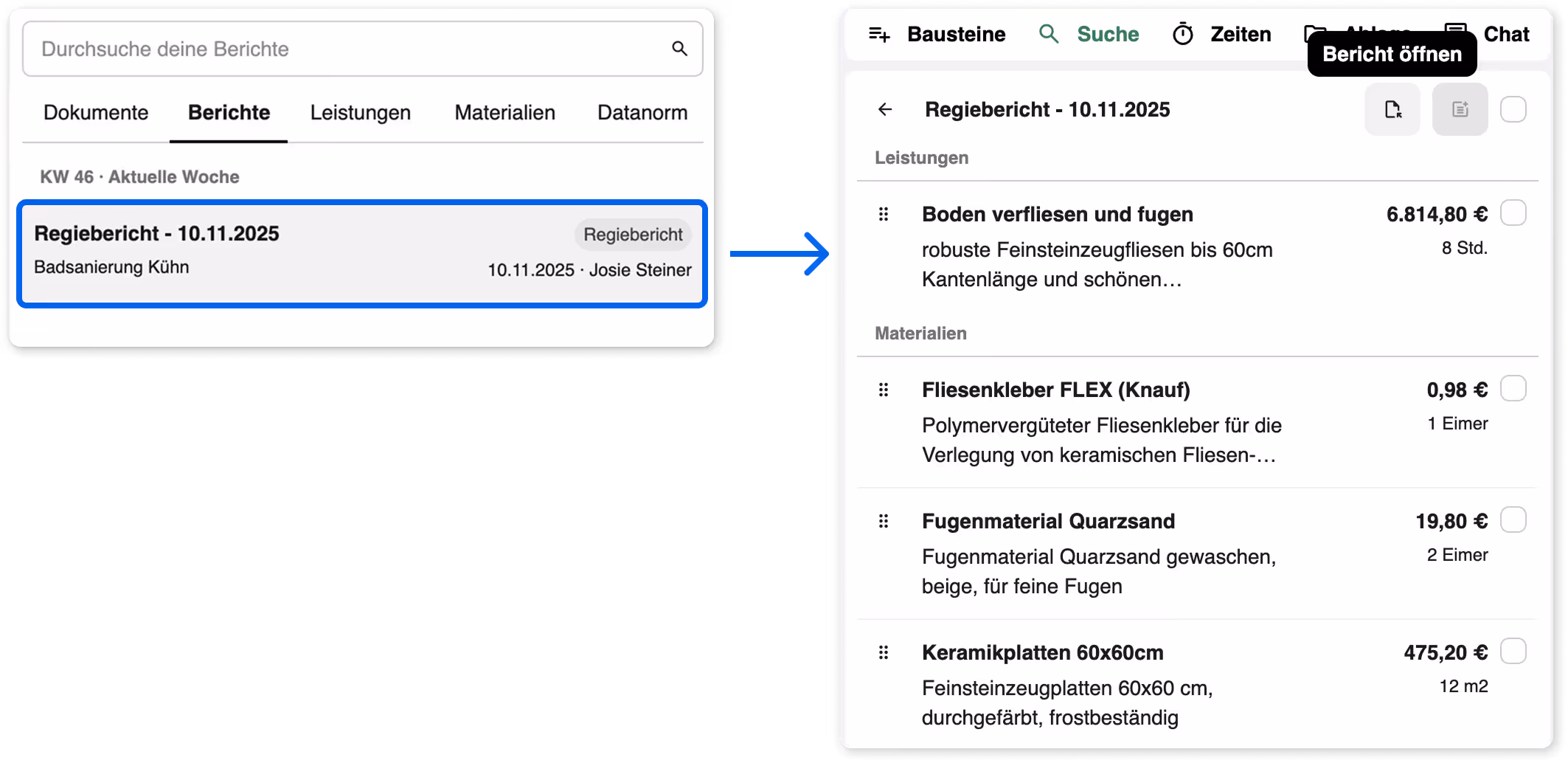 3. Berichte direkt im Dokument öffnen und Inhalte in die Kalkulation übernehmen 📋