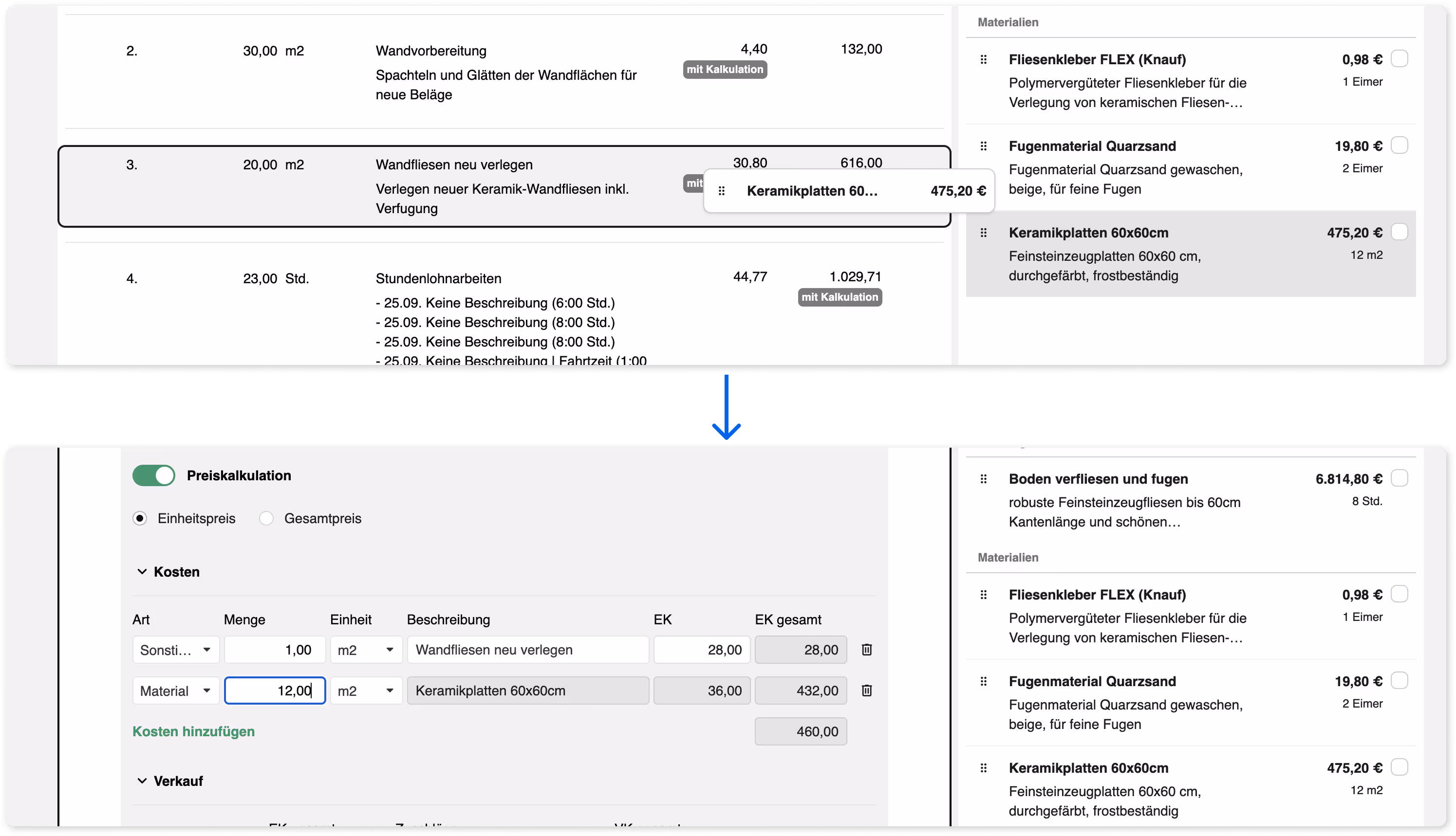 Material- und Lohneinträge kannst du direkt auf eine Position ziehen und so zur Preiskalkulation hinzufügen – das funktioniert auch mit Materialien aus der Material- oder Datanormsuche.