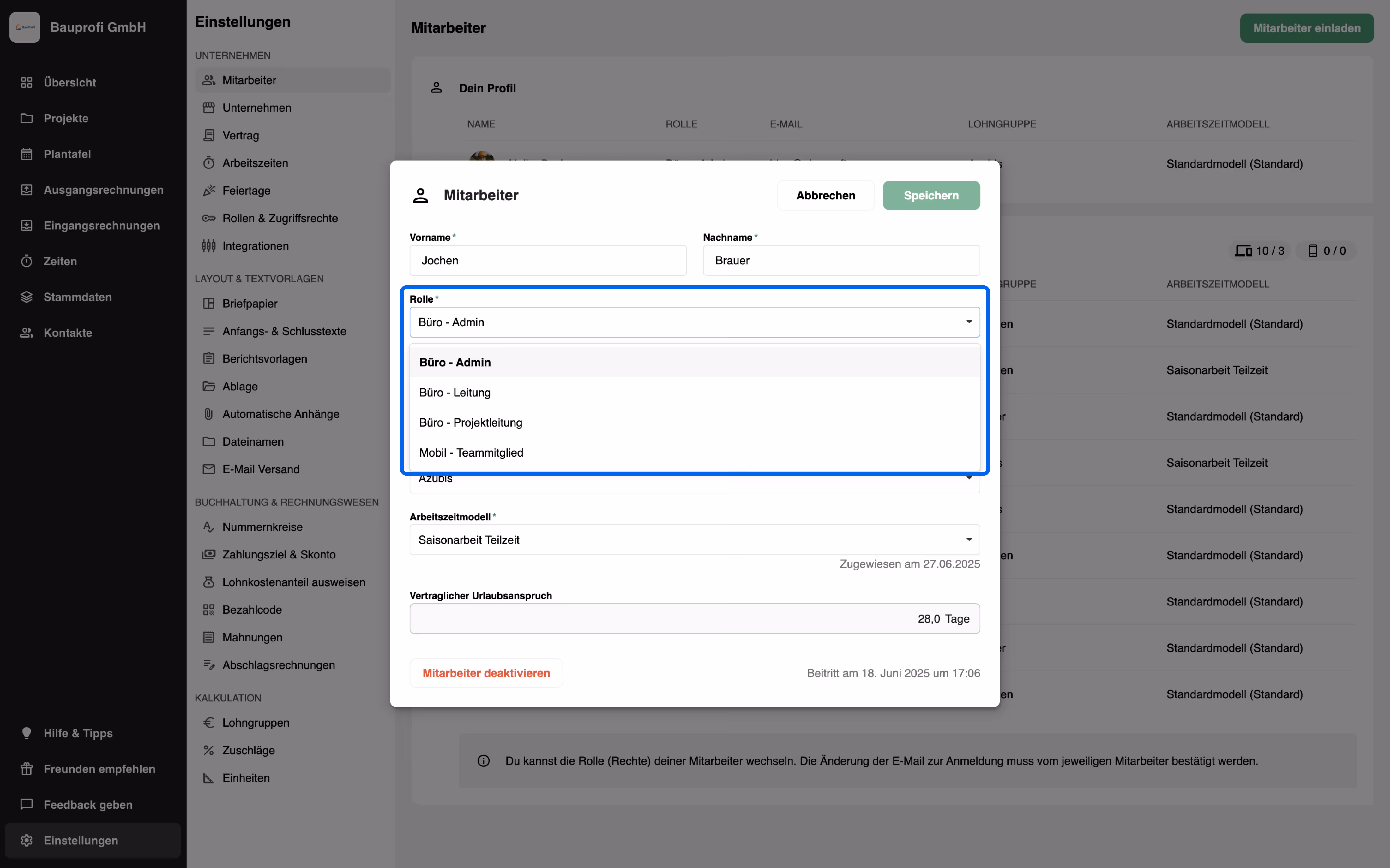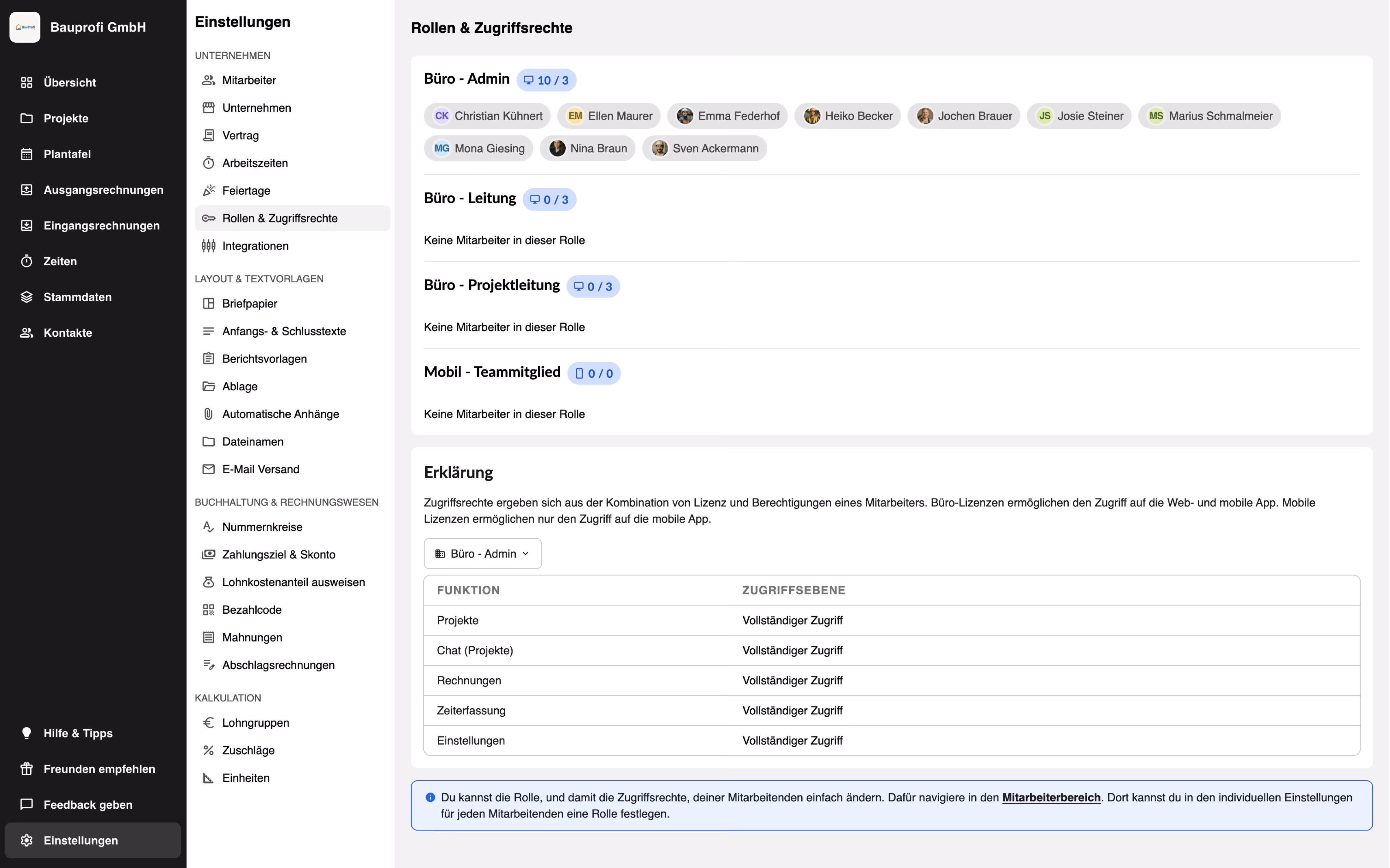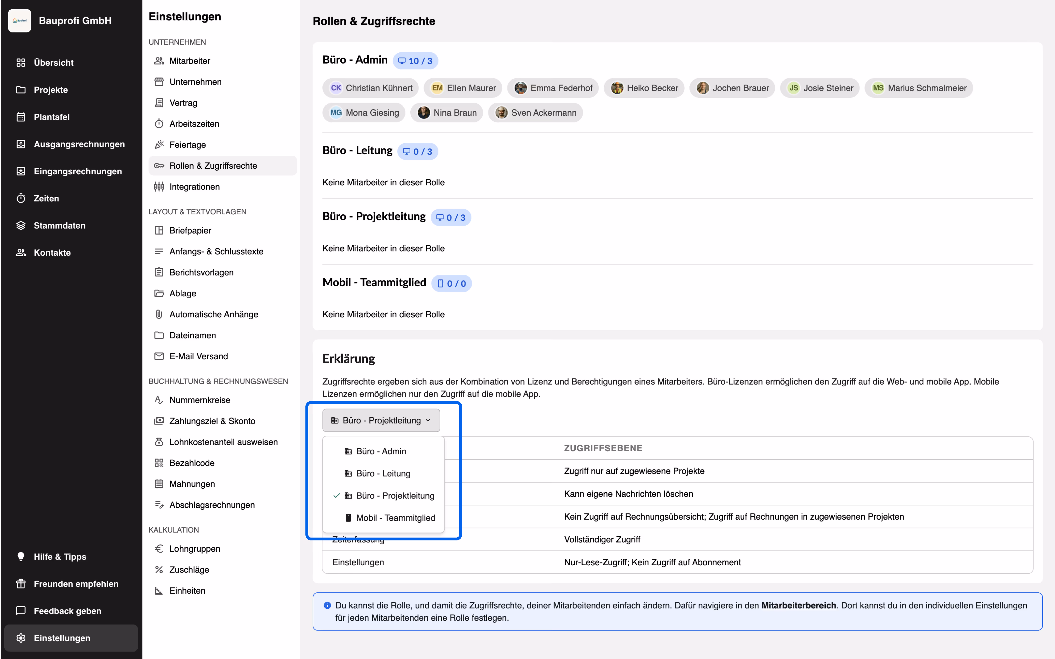Anfang Oktober haben wir eine neue Rolle namens “Büro - Projektleitung” eingeführt. Mit dieser Rolleneinstellung können Büromitarbeitende: