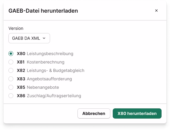 Ab sofort kannst du deine Angebotsdokumente in allen gängigen GAEB-Formaten und Versionen herunterladen. Den GAEB-Export findest du wie gewohnt im Download-Menü.
