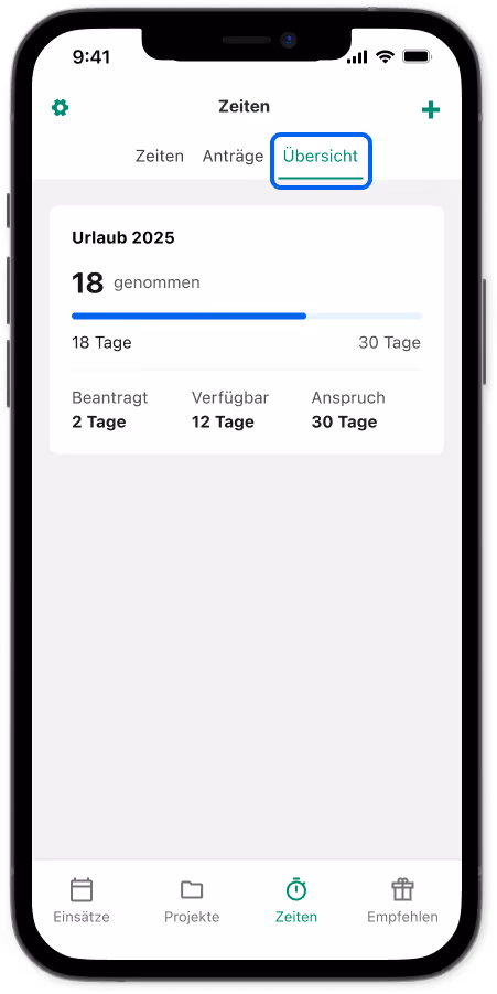 Auch mobile Nutzer können ihren aktuellen Urlaubskontostand jetzt direkt in der App einsehen. Unter „Übersicht“ im Bereich Zeiten sehen sie, wie viele Urlaubstage ihnen zustehen, wie viele sie bereits genommen haben, wie viele noch übrig sind und welche noch auf die Freigabe durch den Admin warten.