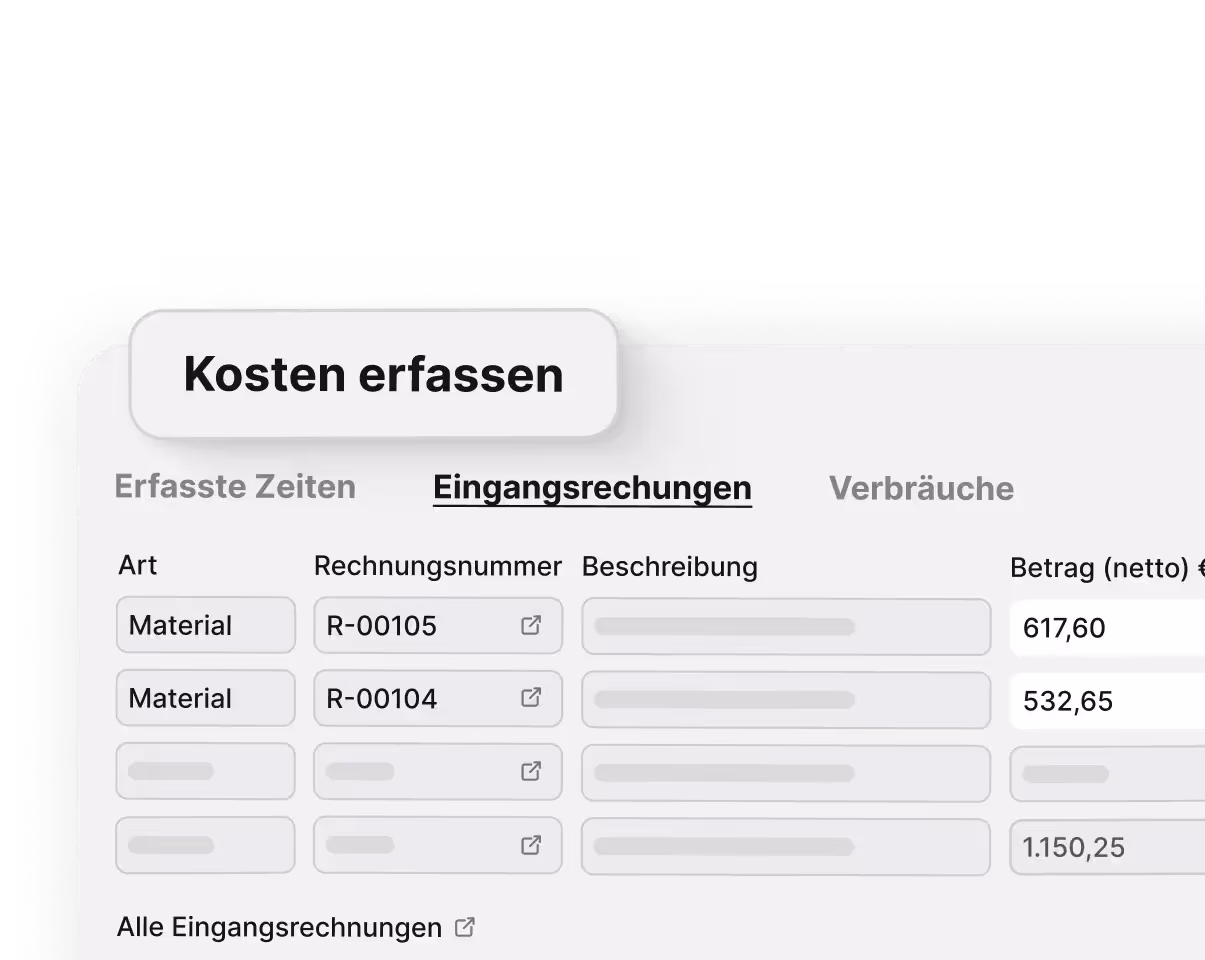 Sobald du eine Rechnung einem Projekt zuweist, tauchen die Kosten automatisch in der Nachkalkulation auf. So kannst du sicher sein, dass alle Ausgaben vollständig und korrekt erfasst sind, ohne doppelte Arbeit oder Zahlendreher.