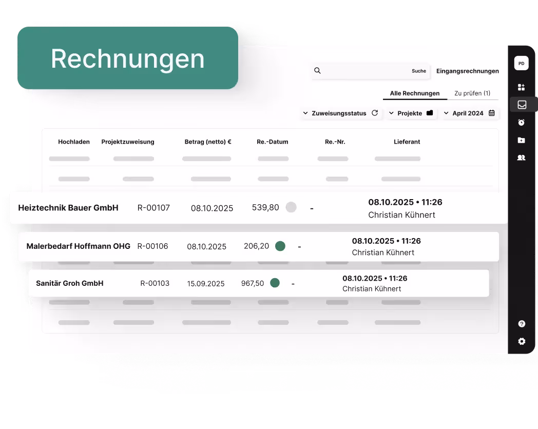 Auf deiner Übersichtsseite findest du alle Eingangsrechnungen auf einen Blick. Mit intelligenten Filterfunktionen kannst du gezielt nach Projekten, Lieferanten oder Zeiträumen suchen und deine Ausgaben jederzeit nachvollziehen, Volle Transparenz, ohne Excel-Chaos.