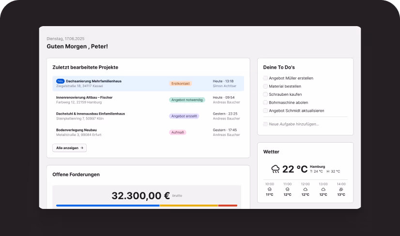 Entdecke alle neuen Funktionen bei plancraft: Von der anpassbaren Übersicht mit Wetter & To-dos über Rechnungen direkt aus Berichten bis hin zu digitalen Berichtsheften für Azubis. Jetzt informieren!