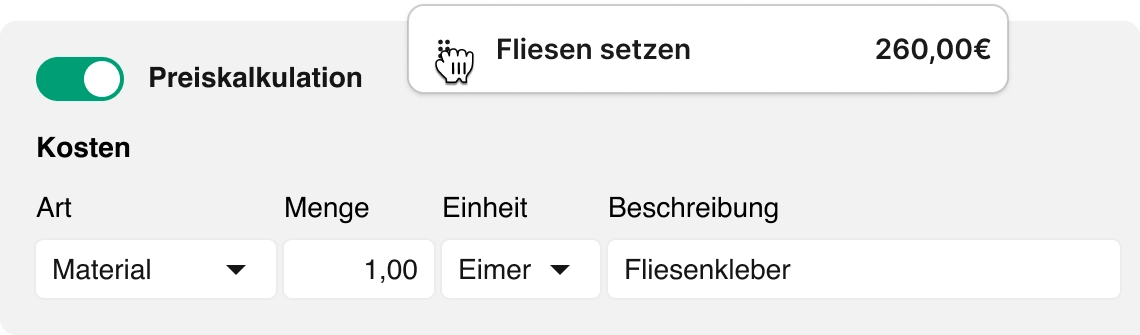 Drag & Drop von Materialien und Leistungen zu Kalkulationen