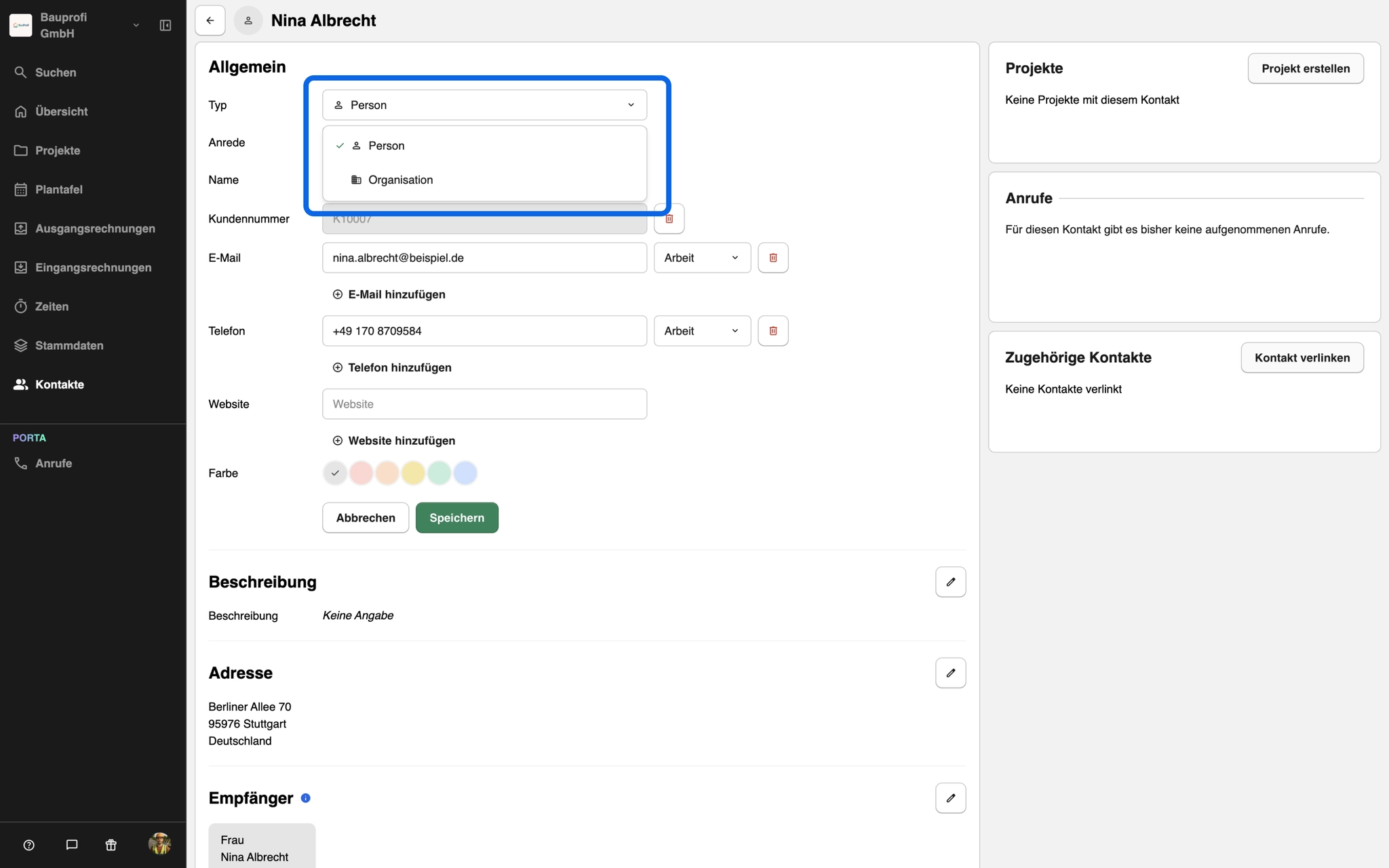 Ist ein Kontakt fälschlicherweise als Person oder Organisation angelegt worden, kannst du den Typ ganz einfach umändern.