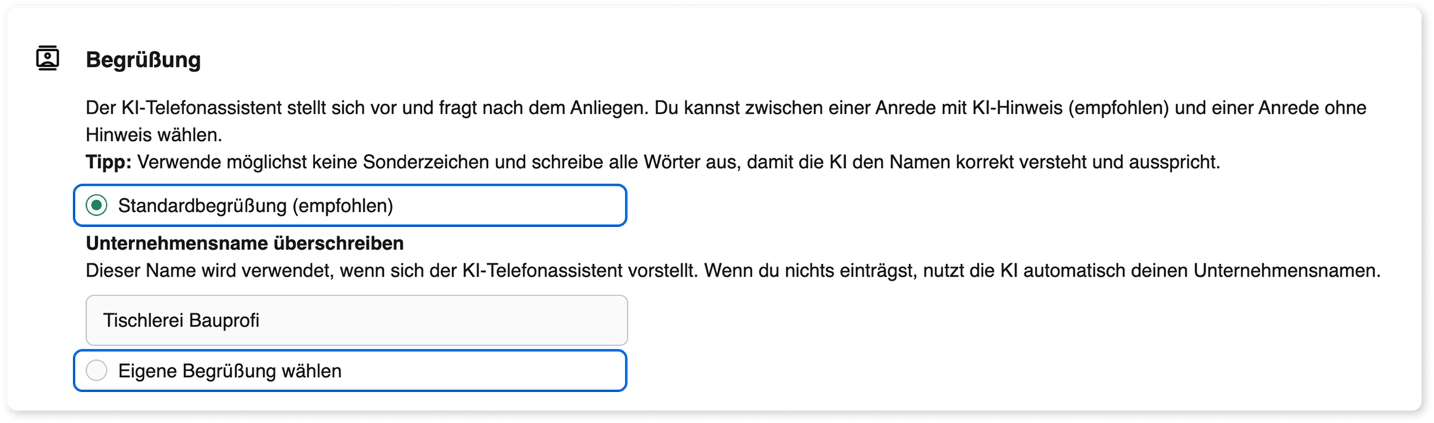 Ab sofort bestimmst du, wie sich dein KI-Assistent am Telefon meldet. Wähle die Standardbegrüßung, bei der sich PORTA automatisch als KI-Büro deines Betriebs vorstellt – den Firmennamen kannst du dabei auch überschreiben. Oder hinterlege eine komplett eigene Begrüßung. So entscheidest du selbst über Wortwahl und Ton.