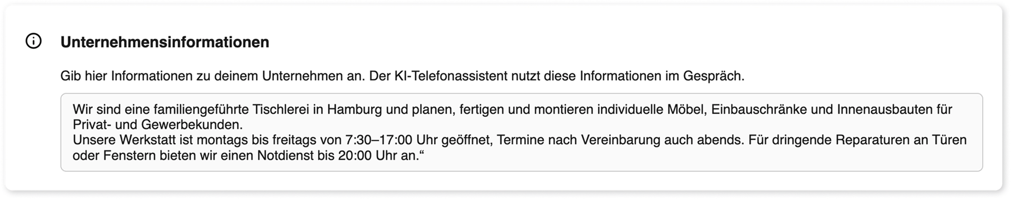 Beschreibe deinen Betrieb, deine Leistungen, Öffnungszeiten oder Notdienst-Verfügbarkeit – alles an einem Ort. PORTA nutzt diese Angaben als Wissensbasis während des Gesprächs: Wenn ein Anrufer eine Frage stellt, die damit beantwortet werden kann, gibt der Assistent die Auskunft direkt. Andernfalls bietet er einen Rückruf an.