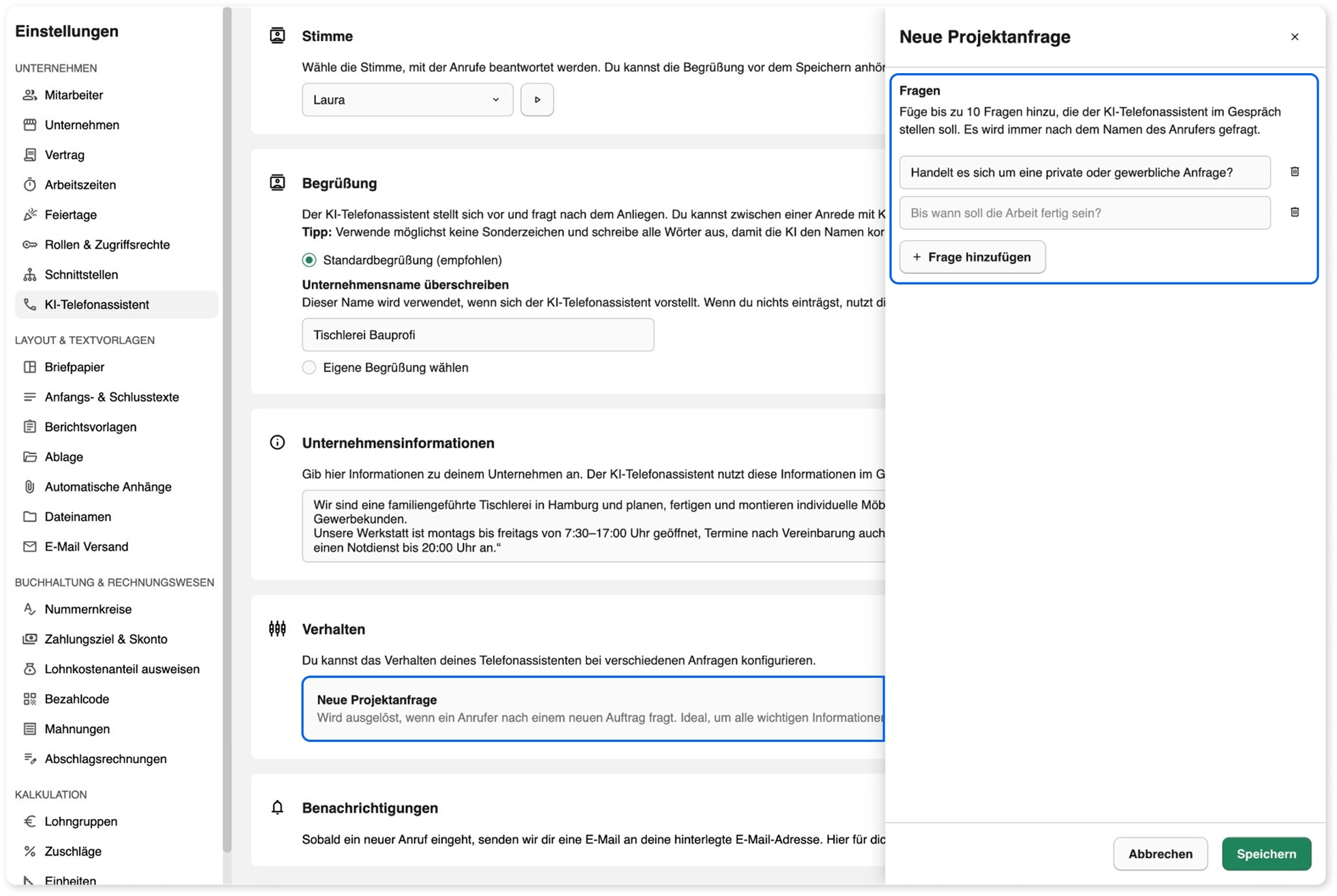 Lege bis zu 10 eigene Fragen fest, die PORTA bei neuen Projektanfragen stellt – zum Beispiel zu Zeitraum, Projektart, Ort, Umfang oder Budget. Der Assistent arbeitet die Fragen nacheinander ab und erfasst zusätzlich immer Name, Adresse und Telefonnummer. So bekommst du strukturierte Anfragen, ohne selbst ans Telefon zu müssen.