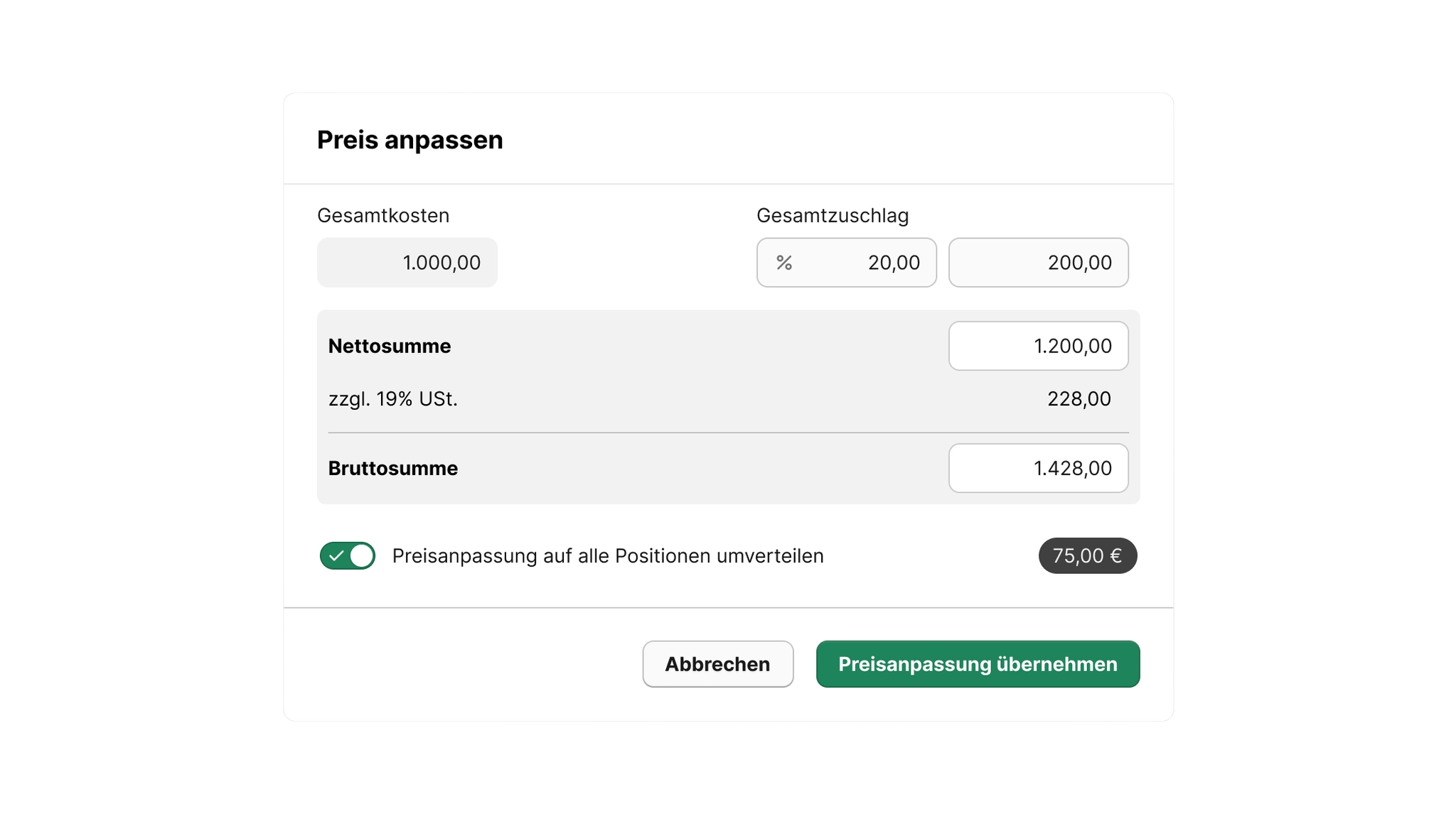 Sobald du die Änderungen übernimmst, wird die Preisanpassung proportional auf die ausgewählten Positionen verteilt.