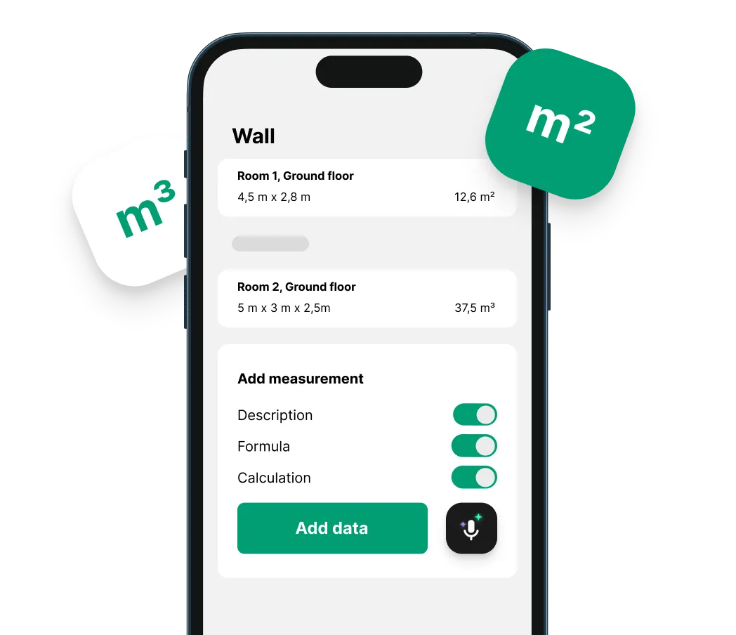 Call out measurements on-site and they are instantly captured, calculated, and synced. Whether it's square meters of drywall or installed meters of pipe, just speak naturally. Our AI converts your words into accurate data – handling units, calculations, and even material estimates automatically.