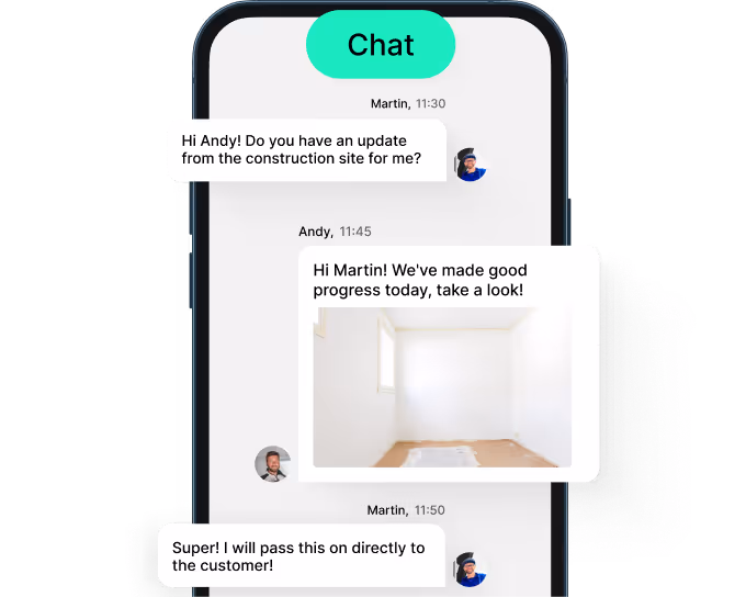 Improve team communication thanks to project-based chat. This allows you to communicate between construction site and office in real time. The chat is integrated directly into every project, so that you have all relevant conversations and data in one place and can also keep an eye on this for deductions and invoices.