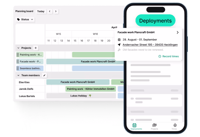 Make sure you always have the right people in the right place at the right time. Thanks to the planning board, you can always see the availability of your employees and plan them for the respective construction sites by clicking on them.