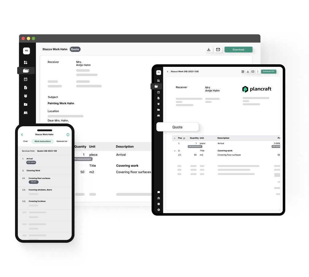 Create precise offers and invoices quickly and easily. With just a few clicks, you can generate documents and send them to the customer directly from plancraft.