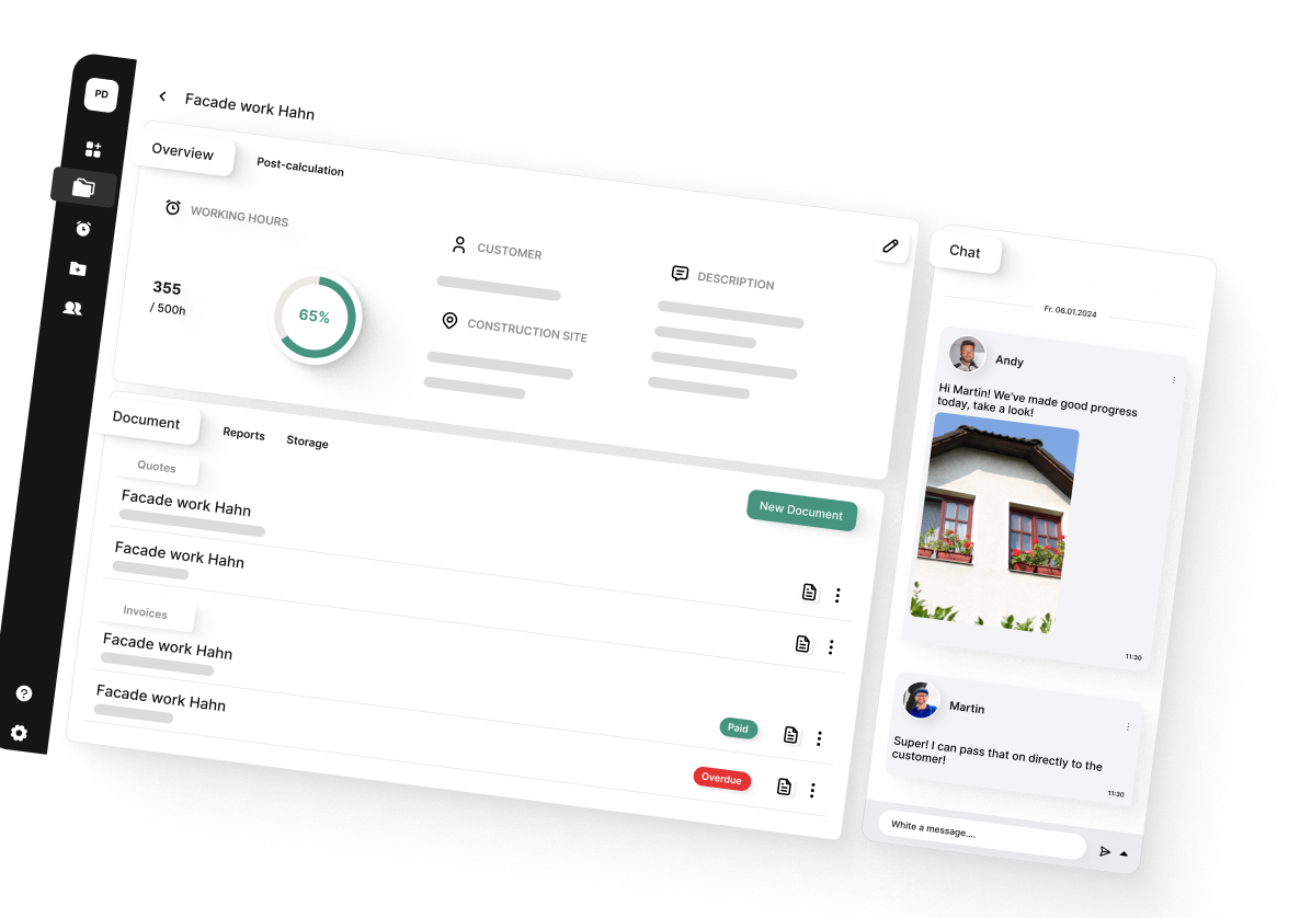 Improve team communication thanks to project-based chat. This allows you to communicate between construction site and office in real time. The chat is integrated directly into every project, so that you have all relevant conversations and data in one place and can also keep an eye on this for deductions and invoices.