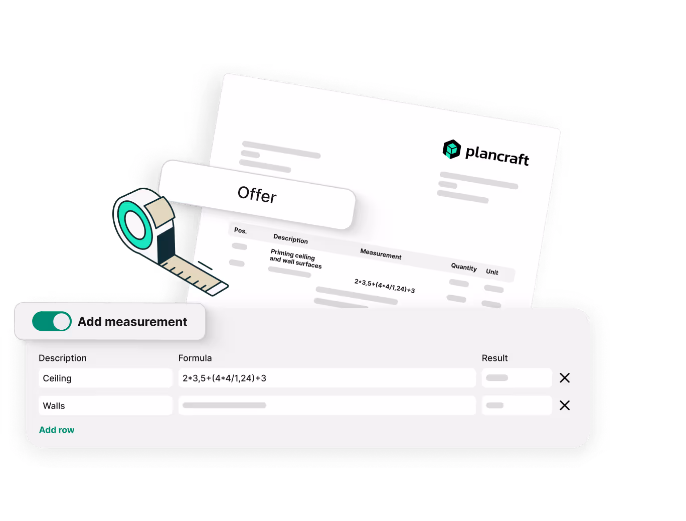 Generate a separate measurement sheet in plancraft for your calculations and descriptions. Choose whether you want to integrate it directly into your offers and invoices as an attachment—fully automated and professional.