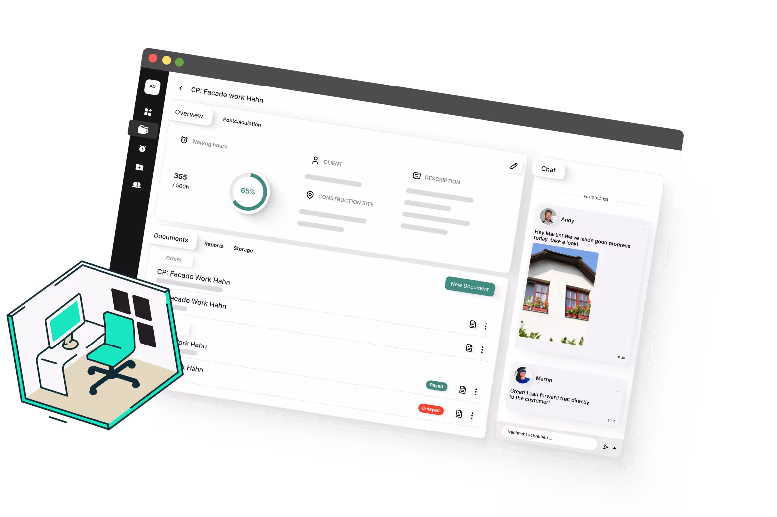 The project-specific chat enables internal communication of messages, photos, and more. Whether for the team in the office or on-site, the chat works across all devices and ensures seamless communication.