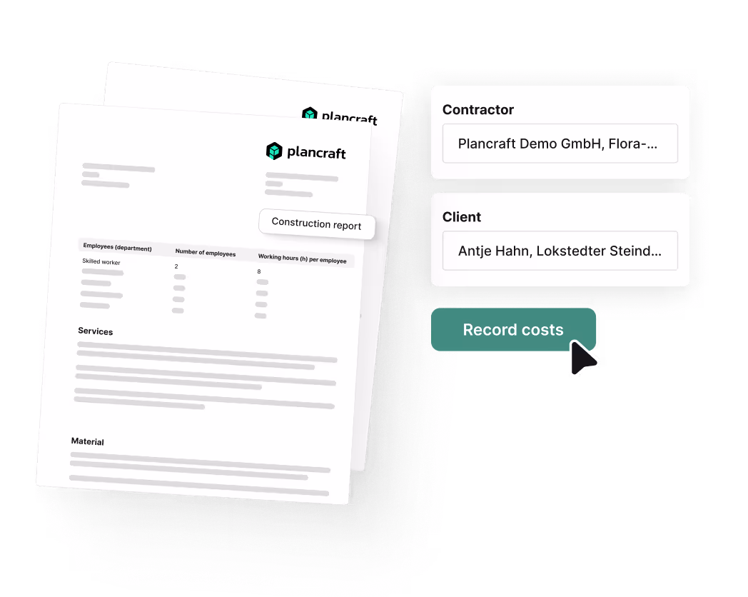 Keep track of working hours and project costs at all times with the digital construction file. Compare planned and actual times, record additional services directly in the project and thus ensure transparent costs. Manage your construction project economically and react early to deviations — for more control and security with Plancraft.