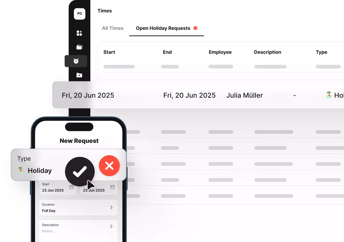 With plancraft, you can now apply for and manage vacation days just as easily as your working hours. Whether on a mobile phone or on a computer — vacation requests are submitted in just a few seconds. Admins keep an eye on all requests and can approve or reject them directly. After approval, the vacation is automatically adopted as a time entry. This gives you full transparency about the team's vacation planning at all times and ensures smooth processes on the construction site and in the office.