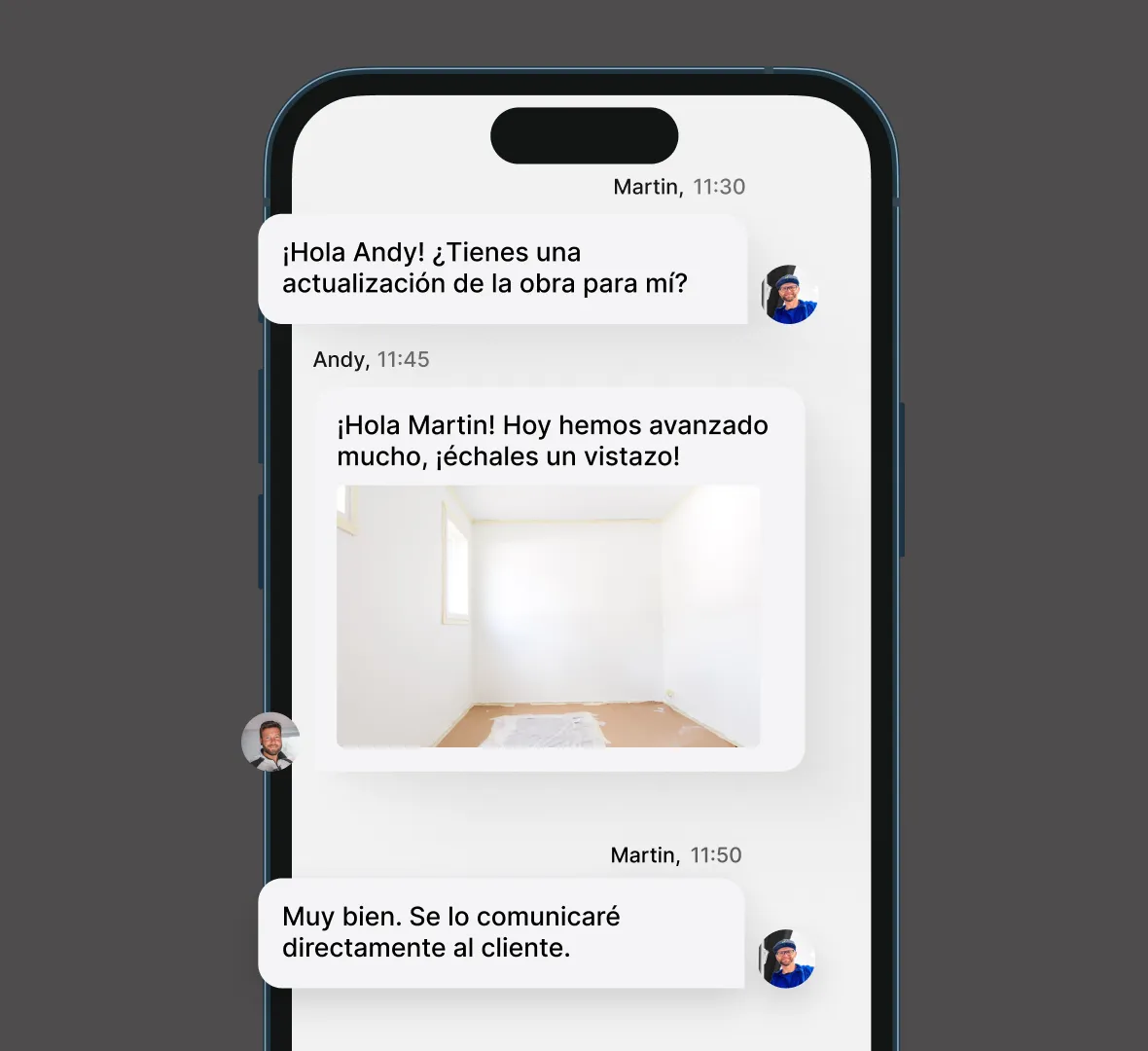 Mejora la comunicación del equipo con nuestro chat en cada proyecto. Permite la comunicación en tiempo real entre obra y oficina. El chat está integrado directamente, de manera que tienes todas las conversaciones y datos relevantes en un solo lugar, también visibles para facturación y pagos parciales.