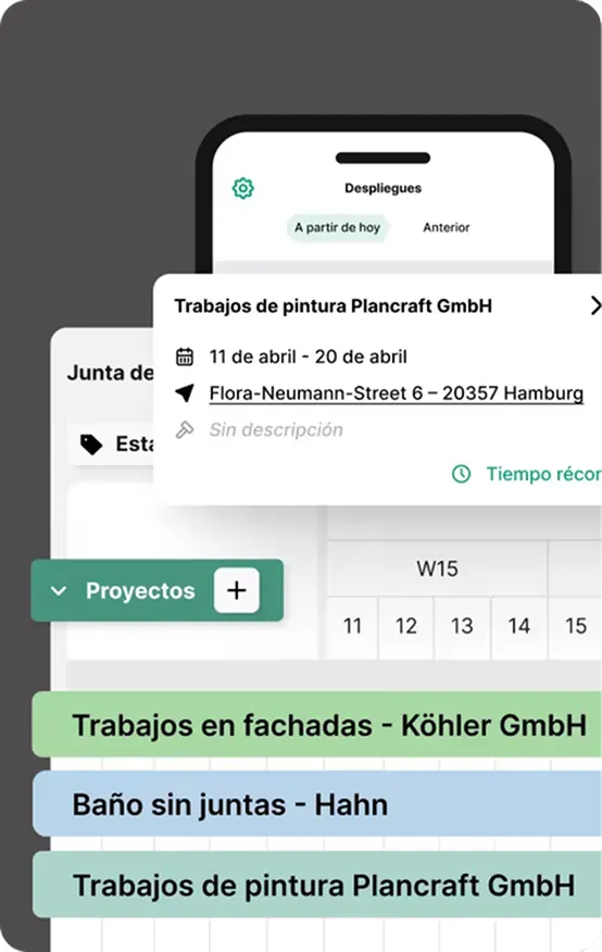 En el tablero de planificación mantienes el control sobre tus obras y empleados actuales. Ellos registran sus horas de trabajo y documentan tareas de manera sencilla a través de la aplicación móvil. Los tiempos registrados se integran en tiempo real en el proyecto gracias a la nube, para que siempre tengas todo bajo control. ¡No puede ser más intuitivo!
