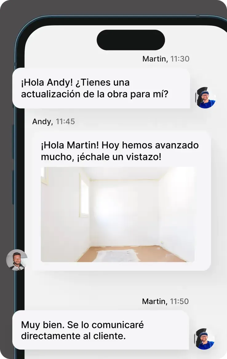 Mejora la comunicación del equipo con nuestro chat en cada proyecto. Permite la comunicación en tiempo real entre obra y oficina. El chat está integrado directamente, de manera que tienes todas las conversaciones y datos relevantes en un solo lugar, también visibles para facturación y pagos parciales.
