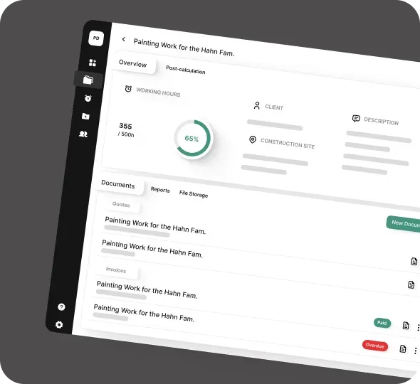 Con la documentación de obra y la revisión de costes, tienes el seguimiento de tu obra bajo control y mantienes tu ganancia a la vista gracias a las listas de facturas y recordatorios. La rápida creación de facturas asegura que los clientes regresen con gusto.