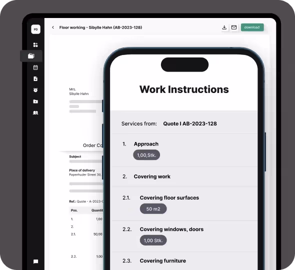 Crea documentos de trabajo profesionales en pocos minutos, de forma sencilla gracias a la intuitiva función de arrastrar y soltar y la gestión fluida de tu catálogo. Plancraft genera automáticamente instrucciones de trabajo directamente desde tu confirmación de pedido y las transfiere a la app de los empleados. Así, tus empleados tienen toda la información importante siempre a mano en su bolsillo. Así es como funciona el software moderno para artesanos en la nube: ¡eficiente y sin esfuerzo!