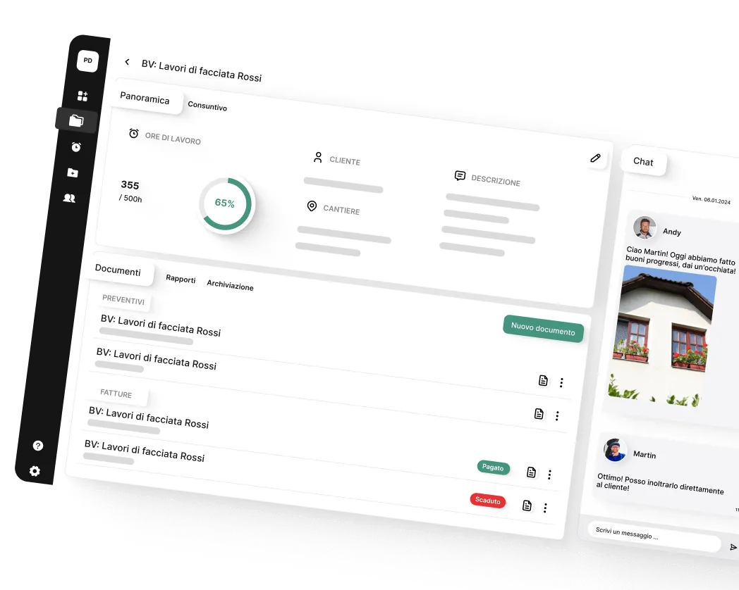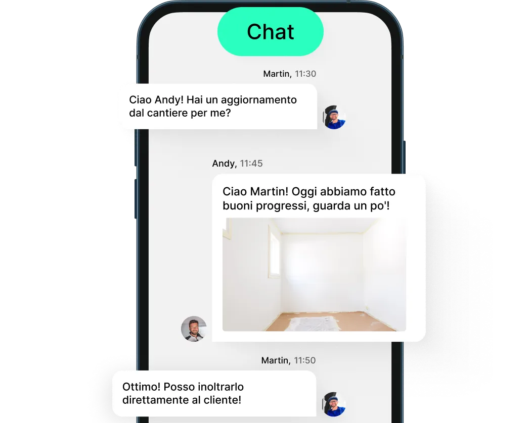 La chat specifica per progetto consente lo scambio interno di messaggi, foto e altro. Che sia per il team in ufficio o in cantiere, la chat funziona su tutti i dispositivi e garantisce una comunicazione fluida.
