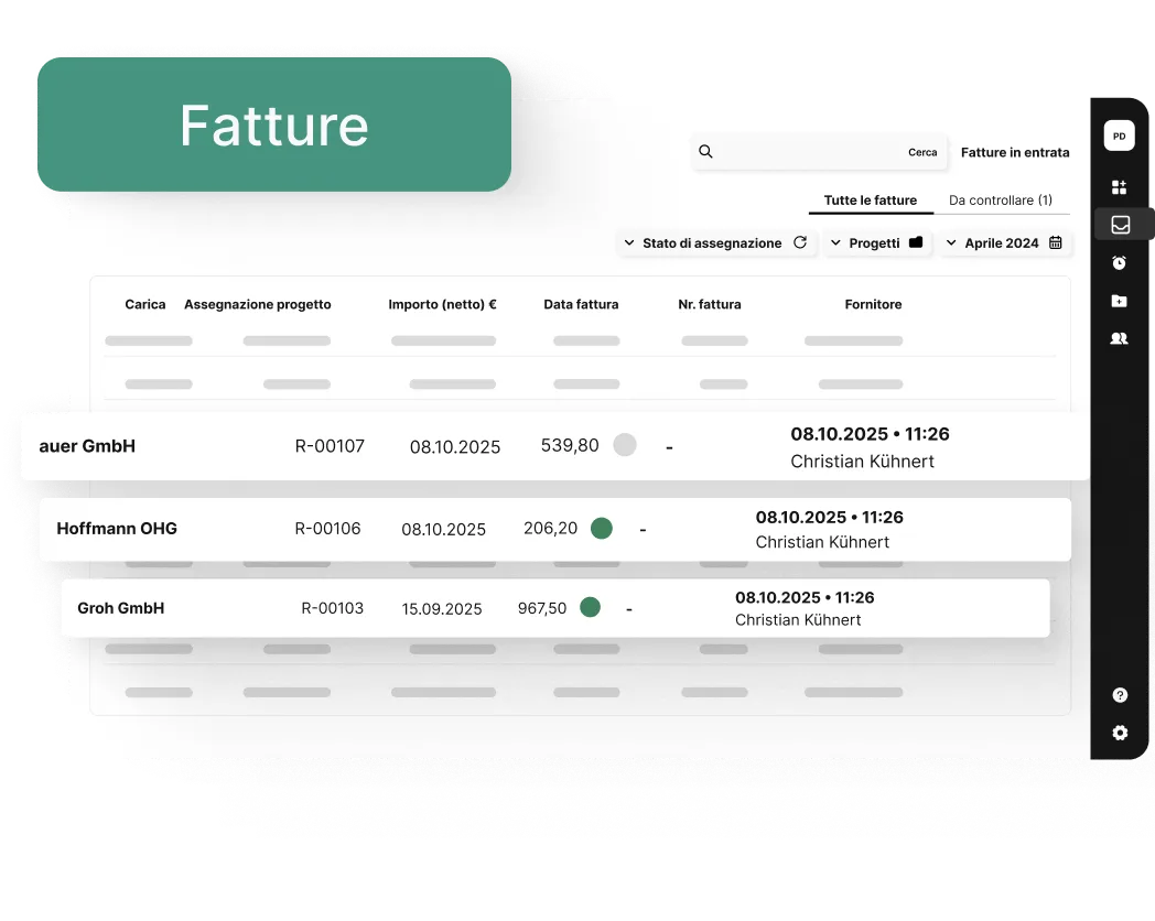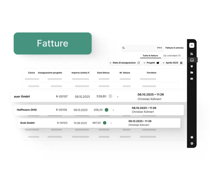 Nella tua pagina di riepilogo trovi tutte le fatture di acquisto a colpo d'occhio. Con funzioni di filtro intelligenti puoi cercare specificamente per progetti, fornitori o periodi e tenere traccia delle tue spese in qualsiasi momento. Massima trasparenza, senza il caos di Excel.