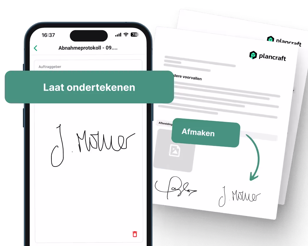Met het plancraft-acceptatiecertificaat kunt u bouwplaatsen direct ter plaatse documenteren. Leg tekortkomingen en feedback van klanten vast, voeg foto's en notities toe en creëer onmiddellijk beschikbare, professionele protocollen voor naadloze communicatie.